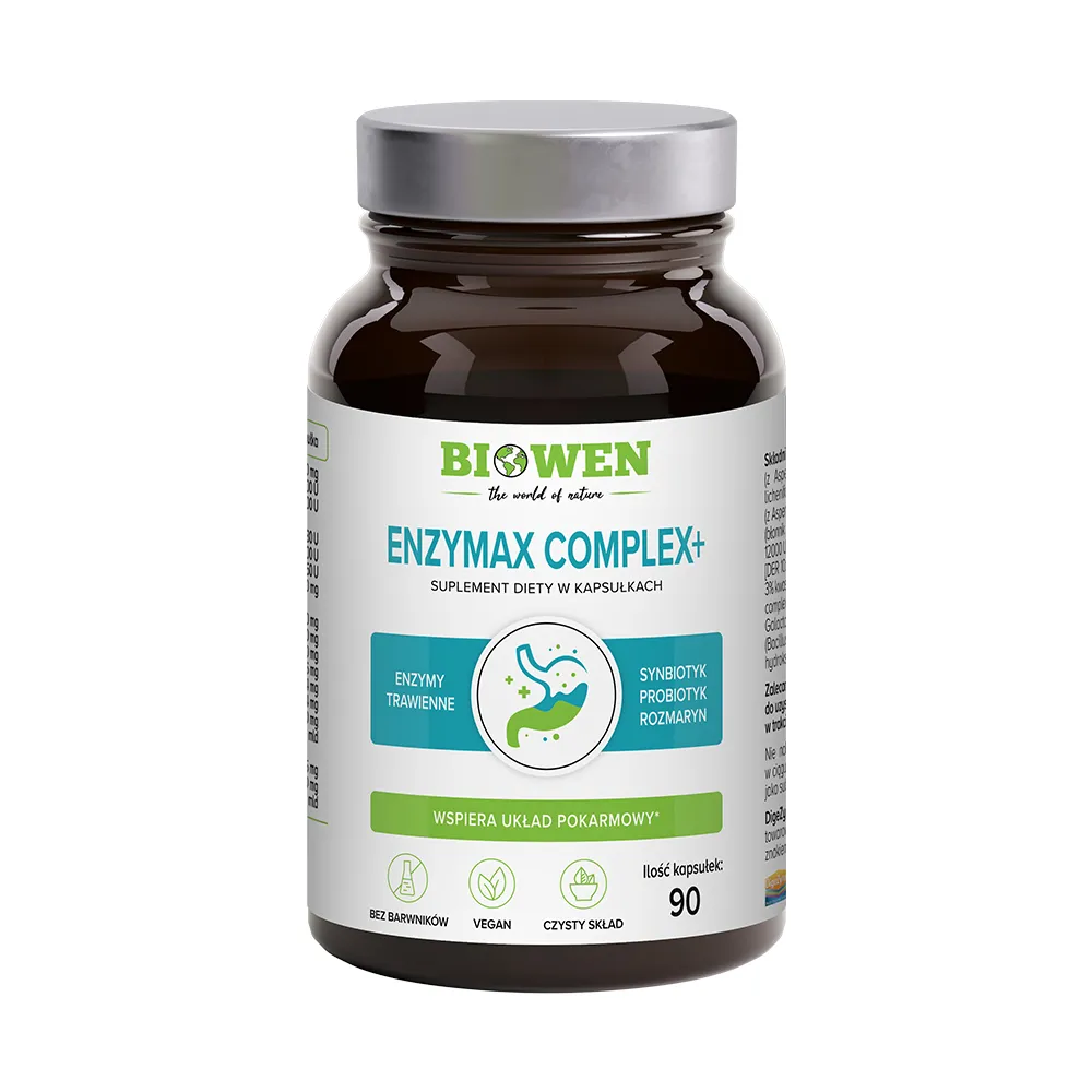 EnzyMax Complex+ od Biowen to kompleksowy produkt, który łączy w sobie enzymy trawienne, błonnik oraz ekstrakt z rozmarynu, standaryzowany na substancje aktywne.
